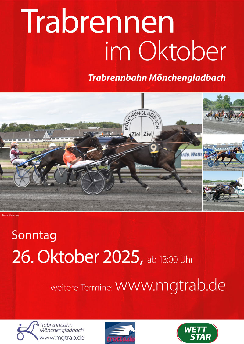 Gesucht wird der Nachfolger von Ito, der den Grand Prix im vergangenen Jahr in beachtlichen 1:14,2 gegen Un Mec Paasloo und Purple Rain hatte gewinnen können. Wird es Michel D (Michel van Dijk), Mon General (Thomas Maassen) oder Lake Louise (Nicole Saleh) im 2. Vorlauf sein, oder aber Carlo Paolo (Paul Kuhsträter), Max Hazelaar (Julia Holzschuh), Ina Gual (Thomas Maassen) oder Bagalut SC (Rodegang Elkendorf) im 1. Vorlauf? Oder aber ein ganz anderer? Fragen über Fragen zum diesjährigen „Großer Preis der Stadt Mönchengladbach“, der dieses Mal zunächst zwei Vorläufe (3. und 4. Rennen) vorsieht und sich die jeweils fünf Bestplatzierten für das Finale qualifizieren, das als 9. Rennen gestartet wird und durch die Albert und Edda Darboven-Stiftung Unterstützung findet. Dotiert ist das Finale mit 6.000 Euro und spricht Pferde in der Gewinngarnitur bis 18.000 € an, ist dieses Mal den Amateurfahrern vorbehalten. Angeboten wird ferner ein Finale B, für die Pferde, die sich nicht für den Endlauf qualifizieren konnten. Dieses würde dann als 11. und somit letztes Rennen gestartet, ist schließlich noch einmal mit 1.500 € dotiert.